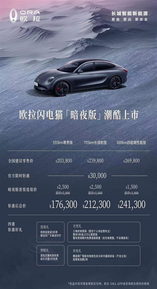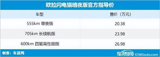 10月31日,欧拉闪电猫暗夜版正式上市。新车共推出3款车型,售价区间为20.38-26.98万元。同时,新车将提供官方限时钜惠3万元,优惠后价格为优惠后是17.63-24.13万元。另外,现在订购新车还将享受选装礼、无忧礼、智联礼以及充电礼等(详情请咨询当地经销商)。