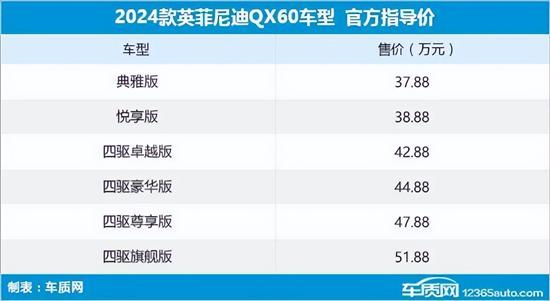 2023年11月1日,英菲尼迪官方宣布旗下2024款英菲尼迪QX60正式上市。新车共计推出6款车型,售价区间为37.88-51.88万元。新车整体设计与现款车型保持一致,将新增流光铂金、拂晓蓝灰两款双色车身颜色,动力部分依旧搭载2.0T发动机。