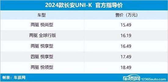 11月3日,2024款长安UNI-K正式上市,新车推出5款车型,售价区间为15.49-18.49万元。作为年度改款车型,新车仅针对配置进行了调整。