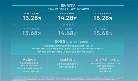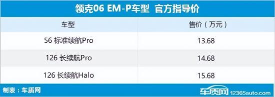 2023年11月5日,领克汽车官方宣布领克06 EM-P正式上市。新车共推出3款车型,售价区间为13.68-15.68万元。此外,官方推出限时领享价,全系车型下订享4000元领享金,优惠后限时售价13.28-15.28万元。领克06 EM-P定位为小型SUV,搭载1.5L插电式混合动力系统,CLTC工况纯电续航里程达到126km。