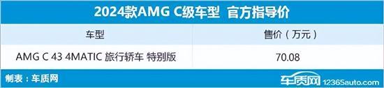 11月6日,2024款AMG C 43 4MATIC旅行轿车特别版正式上市,新车整体变化不大,定位高性能旅行轿车,搭载2.0T发动机。此次上市新车仅推出一款车型,售价为70.08万元。