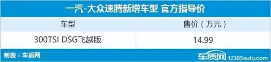 11月7日,编辑从一汽-大众官方获悉,旗下速腾新增一款300TSI DSG飞越版车型,售价为14.99万元。新车将成为1.5T车型中的入门版车型,因此在配置上也会有所调整。