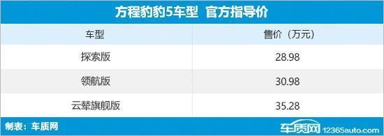 11月9日,方程豹豹5正式上市,新车共推出3款配置,售价区间为28.98-35.28万元。作为方程豹品牌旗下的首款车型,豹5基于比亚迪全新DMO超级混动越野平台打造,定位中型SUV。按计划,今年11月份内将开启豹5探索版和领航版的批量交付,而云辇旗舰版则要等到2024年1月。