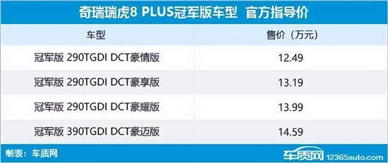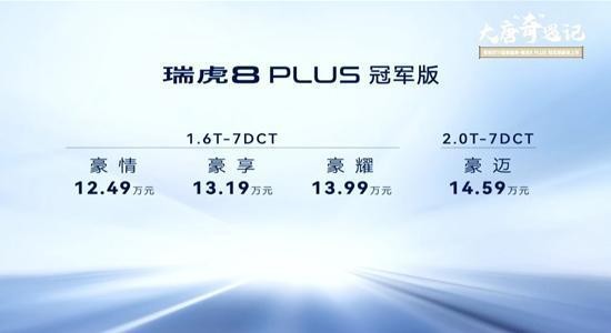 11月10日,奇瑞汽车官方宣布旗下瑞虎8 PLUS冠军版车型正式上市。新车共推出4款车型,售价区间为12.49-14.59万。新车重点针对外观和内饰设计进行了升级,动力部分依旧搭载1.6T和2.0T发动机。