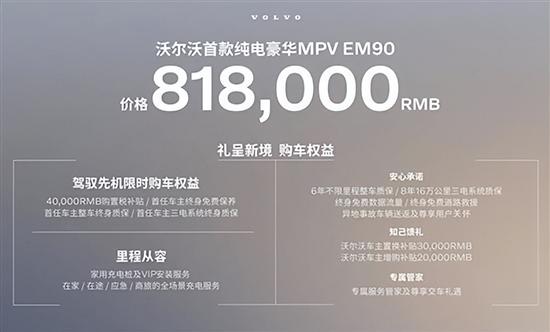11月12日,沃尔沃汽车首款纯电豪华MPV——EM90迎来了全球首秀,并宣布正式上市,官方直售价81.8万元。新车基于SEA浩瀚平台打造,定位纯电动中大型MPV。官方表示,即日起开启中国大陆地区客户预订,下订可享“礼呈新境”购车权益,包含“里程从容”家用充电桩及全场景充电服务,“安心承诺”尊享用车及维保服务,“专属管家”在线专属管家服务,沃尔沃汽车现有用户可享受“知己馈礼”增置换补贴。自2023年11月12日至2023年12月31日下订,更可享受“驾驭先机”限时购车权益,包括购置税补贴,首任车主终身免费保养,首任车主整车和三电系统终身质保权益。