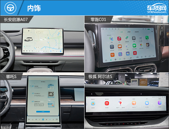 内饰方面,四款车型内部设计简洁,其中零跑C01和哪吒S中控台配备了多块屏幕,展现出较强的科技感。极狐阿尔法S中控台采用了超长的连体屏幕,视觉效果同样震撼。而长安启源A07内部没有配备仪表盘,取而代之的则是HUD抬头显示,搭配悬浮式中控屏幕,科技感同样出色。
