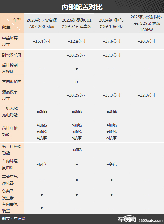 总的来说,长安启源A07、零跑C01和哪吒S内部配置没有拉开太大差距。相比之下,推荐的极狐阿尔法S在配置方面较为落后,如果想得到更多配置的话,需要选购售价更高的车型。