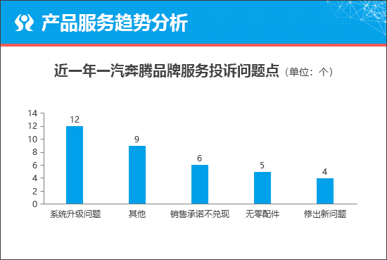 从服务投诉问题点来看,“系统升级问题”和“其他”成为消费者抱怨相对较多的服务问题,通过进一步分析可知,这两类服务问题均来自于奔腾B70车型。