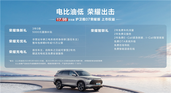 3月18日,车质网从官方获悉,比亚迪护卫舰07荣耀版车型正式上市。新车推出5款车型,售价区间为17.98-25.98万元。荣耀版车型主要针对智能座舱方面进行了升级,同时还新增优化了多项配置以及贝壳白内饰。