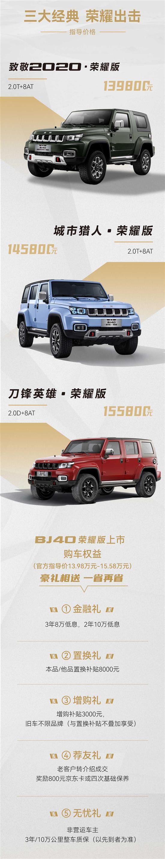 3月18日,车质网从官方获悉,北京BJ40荣耀版正式上市,此次共推出3款车型,售价区间为13.98-15.58万元。与此同时,官方还提供了金融礼、置换礼、增购礼、荐友礼、无忧礼等五大购车权益。