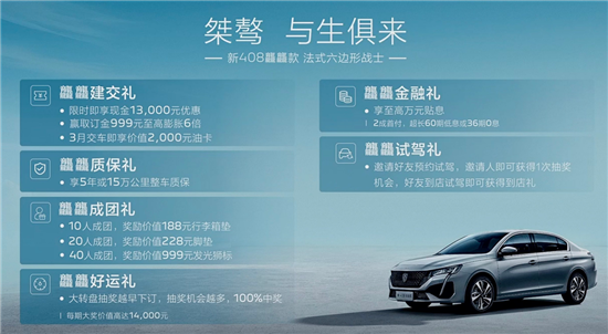 3月18日,东风标致408龘龘款正式上市,新车推出3款车型,售价区间10.97-12.57万元。新车在配置方面有较大的提升,同时还搭载了全新的1.5T发动机。