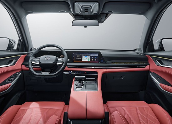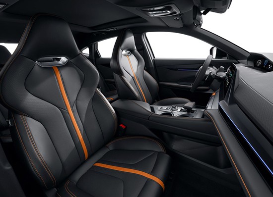 内饰设计变化不大,继续采用10.3英寸液晶仪表+10.3英寸中控大屏的组合,一体式运动座椅与整车的运动风格相符合。配色采用活力橙/疾影橙与酷黑搭配,配合翻毛皮材质的应用,营造出动感十足的座舱氛围。双D型运动方向盘源自赛车设计,并配以随动式换挡拨片。