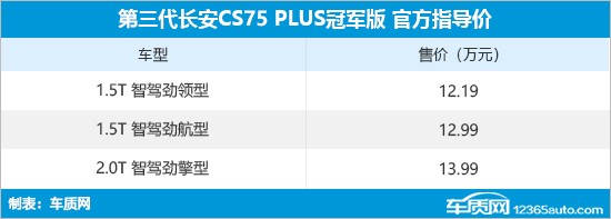 3月20日,第三代长安CS75 PLUS冠军版正式上市,共推出3款车型,售价区间12.19-13.99万元,限时优惠价10.99万元起。新车定位为紧凑型SUV,全系标配L2级智能驾驶系统。