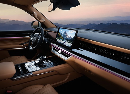 捷途X90 PRO的内饰设计同样换新,提供了更具豪华氛围的棕/黑双拼配色,辅以大面积皮革材质包裹,营造出较强的质感。中控台造型简洁,内置高通骁龙8155芯片的悬浮式15.6英寸无边框中控屏成为了焦点。同时在配置方面,新车还提供了全液晶仪表盘、水晶风格电子挡杆、8扬声器SONY品牌音响、手机远程控制、OTA升级以及50W无线快充等。
