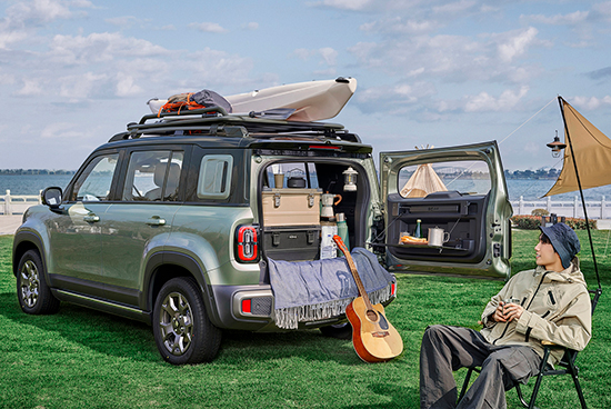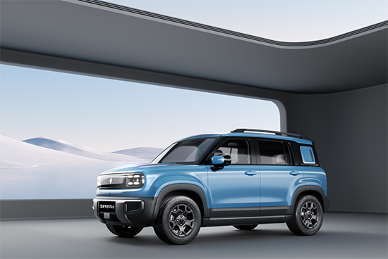 新车侧面延续了方方正正的方盒子造型,线条平直有力,再配合轮眉黑色防擦条,很有硬派越野的味道。值得一提的是,该车的C柱后方还增加了一块车身同色的装饰板,风格上比较类似路虎卫士。车身尺寸方面,新车长宽高分别为3996mm*1760mm*1726mm,轴距2560mm。