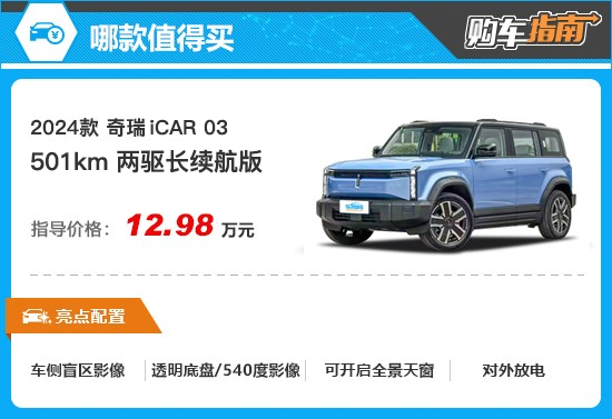 作为奇瑞品牌最新战略下的全新产品,更贴合年轻消费群体的“潮盒电动SUV”奇瑞iCAR 03在不久前正式上市。新车不仅在外观设计上充满个性,同时还配备了iWD智能电控四驱系统,可实现两驱/四驱智能切换。那么,新车哪一款车型最值得选购?本期《购车指南》将为大家提供建议。