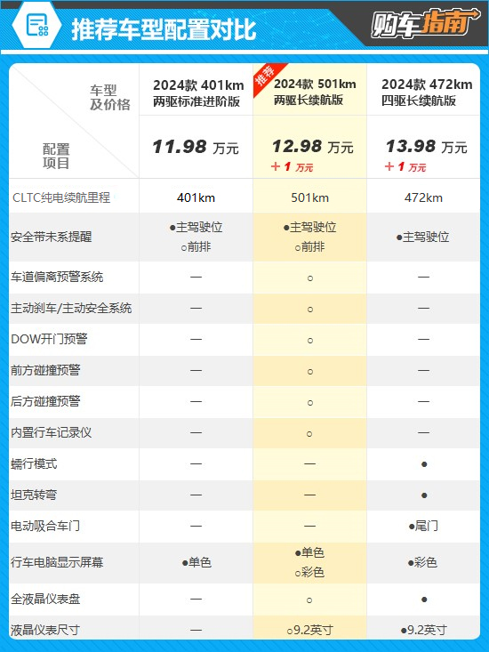 结合全系车型的配置来看,向您推荐501km 两驱长续航版,也就是两驱版的顶配车型。具体来看,推荐车型比低一级别的车型在配置层面基本上保持一致,但增加了很多选装机会,特别是针对辅助驾驶系统方面,消费者可以按需进行选装,自由度更高。另外一个关键的区别在于续航里程,推荐车型的CLTC续航里程是501km,能够更好地满足日常城市通勤所需。