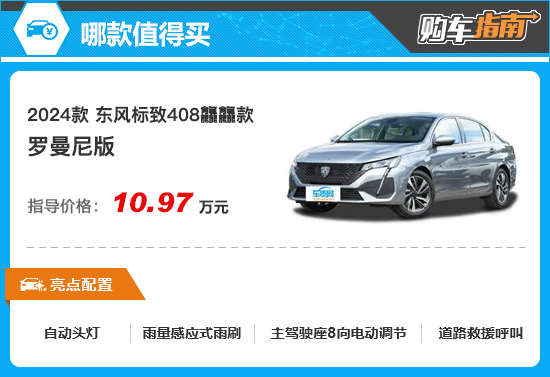 综合价格和配置等因素,对于东风标致408龘龘款的购买建议,编辑重点推荐入门车型罗曼尼版,建议消费者在购买时优先考虑。