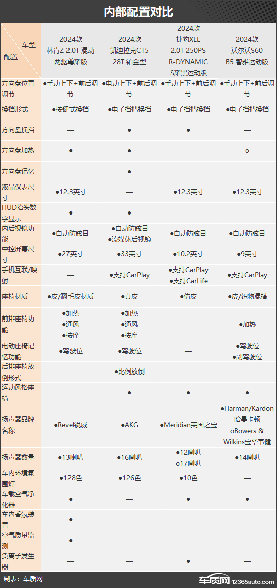 内饰方面,要科技感有林肯Z;要运动前卫有凯迪拉克CT5;要扎实规整有捷豹XEL;要极简设计有沃尔沃S60。虽然整体风格各有不同,但是对于豪华感和品质感的营造,四款车型表现得都很成熟。同外观一样,设计的美与丑这事儿见仁见智,每个消费者都有自己的心头好。