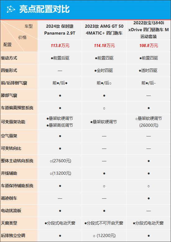 具体到车辆配置层面,我们挑选了售价尽可能相近的车型。通过对比来看,三款车可谓是互有胜负。全新保时捷Panamera虽然是前置后驱车型,但独享空气悬架、主动闭合式进气格栅等配置。宝马8系四门轿跑车标配整体主动转向系统,这会对提升车辆的动态性能有帮助,这一配置在全新保时捷Panamera上需要加价2.76万元选装,AMG GT四门跑车则是连选装的机会都没有。AMG GT四门跑车在配置方面表现中规中矩,比较遗憾的是,其天窗为分段式不可开启天窗。综合来看,全新保时捷Panamera的整体表现更好。