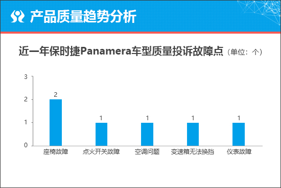 通过对保时捷Panamera车型近一年的投诉数据分析可以发现,不仅投诉故障点较为分散,且投诉量也均为个位数,例如座椅故障、点火开关故障和空调问题等,不排除个案的可能。考虑到全新保时捷Panamera是换代车型,因此可暂且认为其出现上述故障的概率较低,但是否会产生新的问题目前不得而知,还要待其上市使用一段时间后才能有定论。