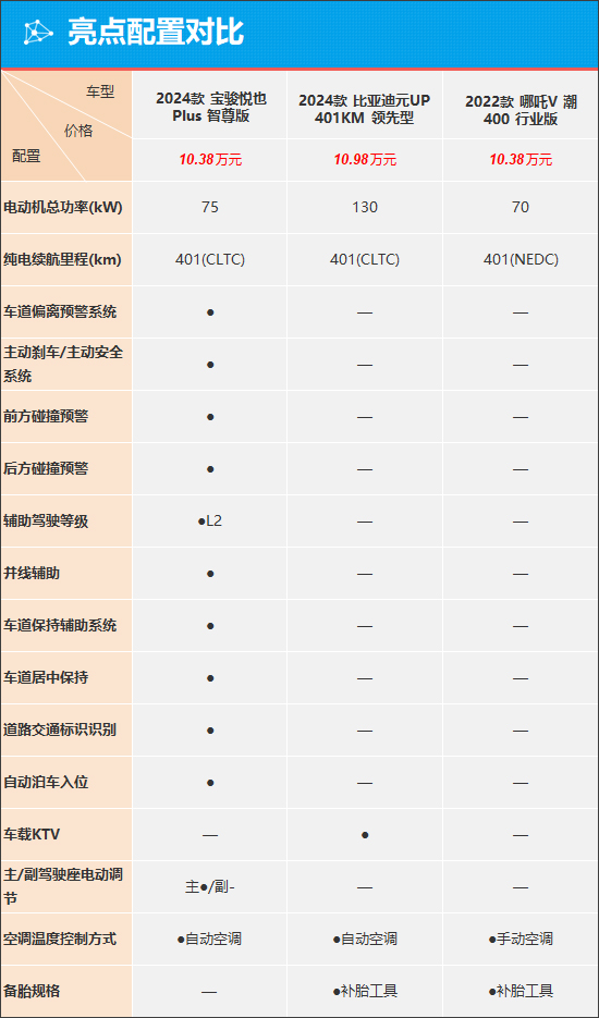 具体到车辆配置层面,我们挑选了售价尽可能相近的车型。通过对比来看,宝骏悦也Plus有着巨大优势,尤其是在智驾方面。相较其余两款车型而言,宝骏悦也Plus不仅支持L2级驾驶辅助,还拥有诸多驾驶功能,行车便利性进一步提升。此外,宝骏悦也Plus还拥有主驾驶座电动调节功能。总的来看,虽然宝骏悦也Plus在车型数量上不占优势,且没有提供补胎工具,但对于追求科技感的消费者而言,其性价比可谓相当之高。