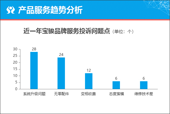从服务投诉问题点来看,“系统升级问题”和“无零配件”成为车主对于宝骏品牌抱怨相对较多的服务问题。通过进一步分析可知,“系统升级问题”来自于宝骏RC-5、宝骏RS-5以及宝骏RS-3等车型;“无零配件”主要集中在宝骏E100和宝骏KiWi EV车型上。