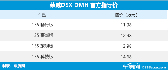 动力方面,荣威D5X DMH搭载全新的1.5T涡轮增压混动专用发动机,并搭载高效双电机混联驱动。发动机最大功率为110kW,驱动电机最大功率为153kW,其 0-100km/h加速时间为6.9秒,WLTC百公里综合油耗为1.27L,馈电油耗5.25L。续航方面,新车CLTC纯电续航里程为135km,CLTC综合续航里程达到1300km。