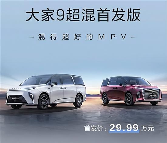 5月21日,上汽大通MAXUS大家9超混首发版正式上市,售价29.99万元。新车定位为中大型MPV,搭载1.5T发动机与电动机组成的插电式混合动力系统,CLTC纯电续航里程为225km,CLTC综合续航里程可达1309km。