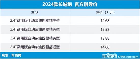 5月22日,2024款长城炮正式上市,其中2.4T乘用炮售价13.88-14.88万元;2.4T商用炮售价12.58-12.68万元。同时,官方还发布6重购车礼,包含现金礼、服务礼、金融礼、老友礼、置换礼以及互联礼。