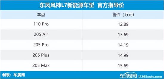 动力系统方面,东风风神L7搭载了由1.5T涡轮增压发动机+电动机组成的马赫电混(PHREV)系统,综合最大功率265kW,综合峰值扭矩615N·m,根据车型配置不同,CLTC纯电续航里程分为110km和205km,CLTC综合续航里程分别为1400km和1500km。