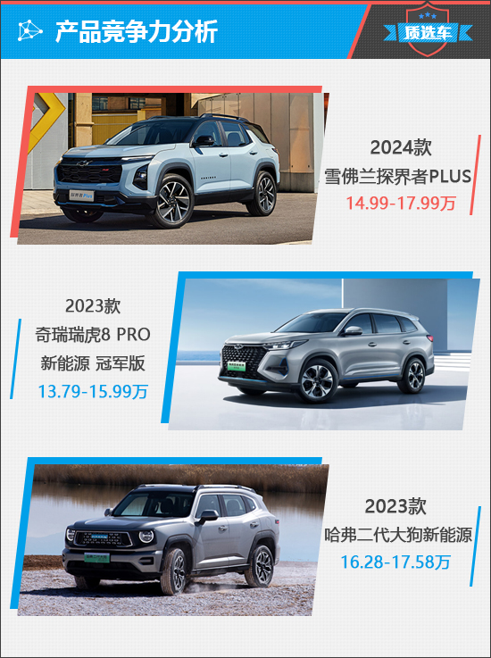 从目前市场情况来看,价格门槛下探至15万元左右的插电混动SUV很少,与雪佛兰探界者Plus处于同一价格区间的车型,主要以自主品牌车型为主。综合考虑多方面因素,2023款哈弗二代大狗新能源和2023款奇瑞瑞虎8 PRO新能源是雪佛兰探界者Plus最直接的竞品车型。