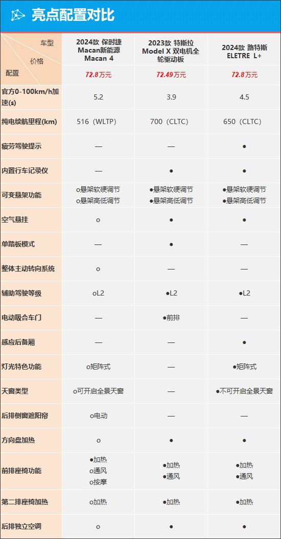 具体到车辆配置层面,我们挑选了售价尽可能相近的车型。通过对比来看,特斯拉Model X和路特斯ELETRE整体表现非常接近,同时也比较符合该级别应有的配置表现。而保时捷纯电动Macan配置表现可以说非常地“保时捷”,大部分舒适性和高阶配置统统需要选装,并且价格还不菲。另外,官方百公里加速表现也不及其他两款车型,整体表现稍显逊色。