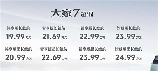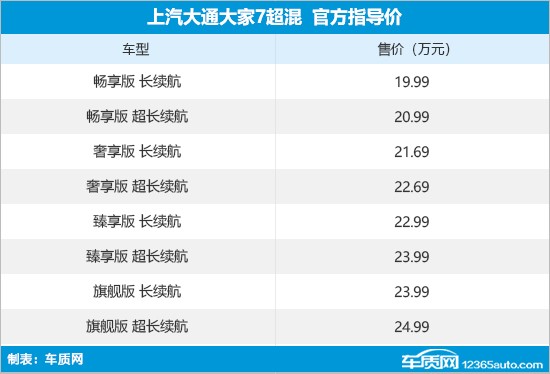 6月7日,上汽大通大家7插电混动版正式上市,新车推出8款车型,售价区间19.99-24.99万元。新车搭载1.5T插混专用发动机,以及24.7kWh磷酸铁锂与39.7kWh三元锂电池组。综合续航超过1300公里。