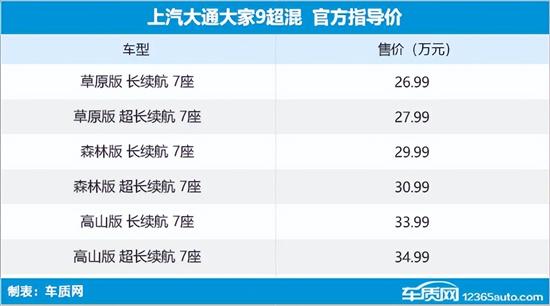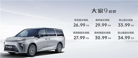 6月7日,上汽大通大家9插电混动版正式上市,新车推出6款车型,售价区间26.99-34.99万元。新车搭载1.5T插混专用发动机,以及24.7kWh磷酸铁锂与39.7kWh三元锂电池组。综合续航超过1300公里。