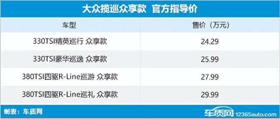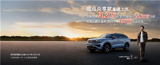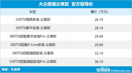 6月7日,一汽-大众揽境/揽巡众享款车型正式上市,其中揽境售价26.19-36.19万元;揽巡售价24.29-29.99万元。新车的售价相比老款车型有所下调,最高降价幅度可以达到4.3万元,除此之外还针对配置方面进行了一定的优化调整。