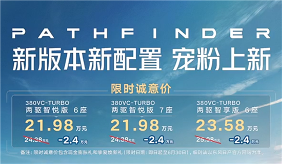 近日,东风日产探陆两驱6座版正式上市,共推出3款车型,售24.38-25.98万,即日起至6月30日限时优惠2.4万元,仅需21.98-23.98万元。