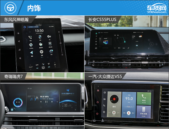 内饰部分,捷达VS5多少有些“原形毕露”,如果把话说得重一些,那么它甚至与另外三款车型都不像是一个时代的产物。当然,规整的设计风格本身并没有任何问题,不仅用料扎实做工细腻,而且最重要的是,实体物理按键及旋钮使用起来确实相当方便。瑞虎7配备时下主流的双联屏,而长安CS55PLUS的中控台则是设计得很有层次感,令人过目不忘。皓瀚的内饰布局比较简约个性,双辐式方向盘搭配竖置中控屏,辨识度相当高。