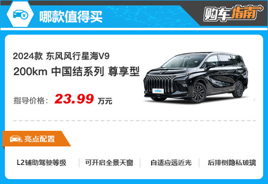 近年来,MPV市场成为车企布局新能源车的新战场,特别是插电混动车型更是成为香饽饽,这类车型解决了MPV油耗高的痛点,也不像纯电动MPV那样存在严重里程焦虑。近期,东风风行星海V9正式上市,消费者又增加了一个新选择。东风风行星海V9定位为中大型MPV,拥有宽敞的车内空间,并在设计中融入了大量中国元素。综合实力不俗的东风风行星海V9到底哪款配置更值得选购?本期《购车指南》将为您详细分析。