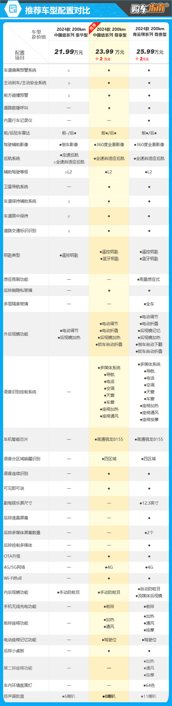 综上所述,厂商指导价为23.99万元的200km 中国结系列 尊享型的性价比更高,消费者在选购时可以优先考虑。