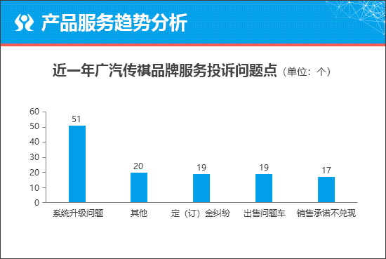 从服务投诉问题点来看,“系统升级问题”成为车主对于广汽传祺品牌抱怨相对较多的服务问题。通过进一步分析可知,这类服务问题来自于传祺GS8、影豹以及传祺GS4 PLUS等车型。