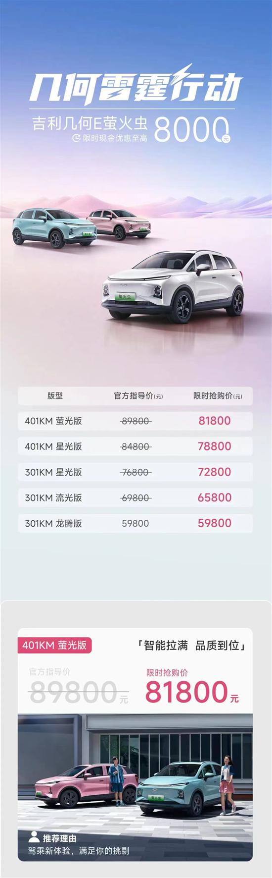 7月5日,吉利汽车宣布旗下几何E萤火虫车型推出限时优惠,7月1日-31日购车可享现金优惠至高8000元,优惠后顶配荧光版车型仅需8.18万元。与此同时,吉利官方还推出了首任个人非营运车主三电终身质保;享24期0首付,年费率0.99%,先享后付;首任车主免费赠送价值3000元专属充电桩及安装服务等多种购车权益。