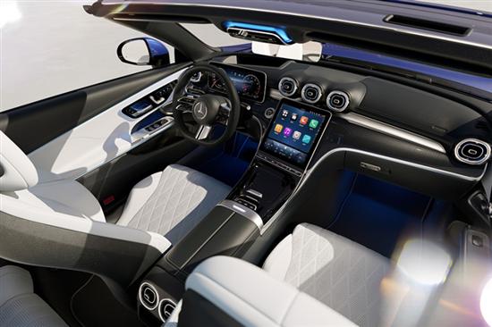 内饰方面,全新CLE敞篷轿跑车搭载第三代MBUX智能人机交互系统,并内置8295车机芯片,兼容QQ音乐、喜马拉雅、腾讯视频等丰富娱乐应用。除此之外,新车还贴心配备头颈暖风系统(AIRSCARF)在低温天气下也能享受敞篷乐趣。