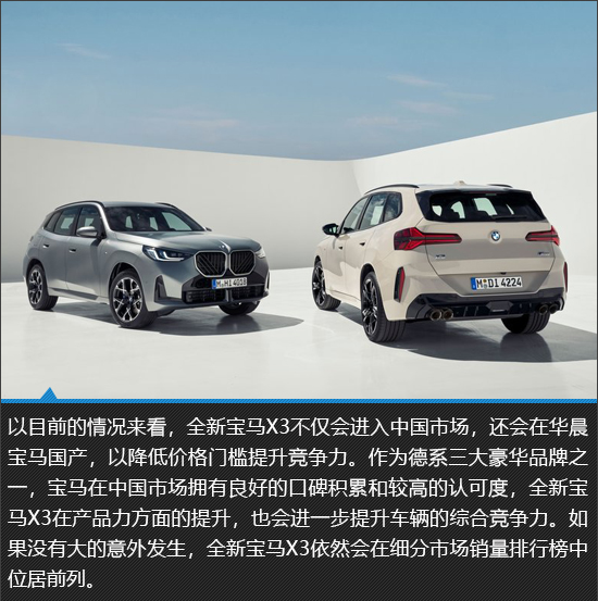 从产品力的角度来看,全新宝马X3是一辆可以满足消费者多重需求的车型,如宝马品牌深入人心的豪华品牌形象、比肩运动轿车的操控性和SUV车型的实用性等。相比上一代车型,全新宝马X3的外观设计要更硬朗、更有厚重感,这也是很多SUV消费者喜欢的风格。因为综合竞争力相比上一代车型有明显提升,笔者非常看好全新宝马X3未来的销量走势。