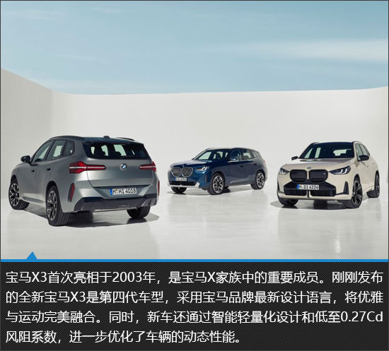 如果想买一辆操控性优异且实用性出色的豪华中型SUV,很多人会首先想到宝马X3。作为宝马X家族的主力车型,宝马X3开创了豪华中型SAV(Sports Activity Vehicle)这一细分市场。在中国市场,宝马X3是宝马X家族的销量冠军。为了保持足够的竞争力,宝马没有停止对宝马X3更新换代的步伐。近期,全新宝马X3官方图片正式发布。按照计划,全新宝马X3将在美国斯帕坦堡工厂和南非的罗斯林工厂生产,并于2024年第四季度率先在欧洲和北美市场上市,随后于2025年1月登陆其他市场。