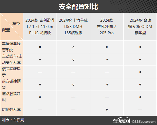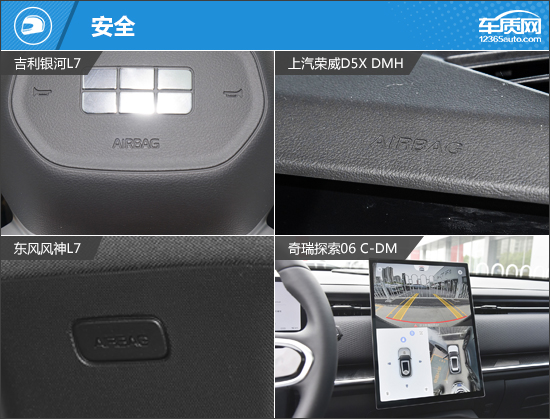 安全配置方面,四款车型的被动安全配置表现均较为出色,而主动安全表现则略有不同。其中,除了荣威D5X DMH多项配置需要选装之外,另外三款车型表现差别不大,探索06 C-DM以微弱的优势领先。