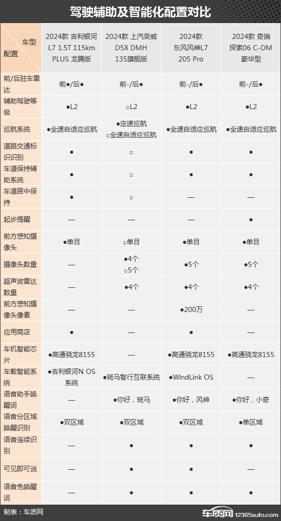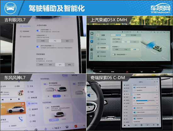 而在智能化配置方面,荣威D5X DMH一反颓势,整体表现与风神L7表现相近,能够提供较为完善的功能体验。而银河L7虽然配备了时下主流的高通骁龙8155芯片,但在智能化功能体验上与其他三款车型相比略显不足。