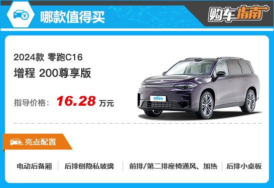 纵观国内汽车市场,有那么一个新势力品牌,没有铺天盖地的宣传,看似不声不响,但就是凭借着“性价比”这一招鲜吃遍天,总是会出现在各大销量榜单中,这便是今天的主角——零跑。不久前,零跑C16正式上市,新车定位中大型SUV,动力方面推出增程式和纯电动两种选择,满足了不同的消费需求。至于价格,当然依旧是十分给力。那么,对于这样一款量大务实特点鲜明的车型应该如何选择?本期《购车指南》将为您详细解析。