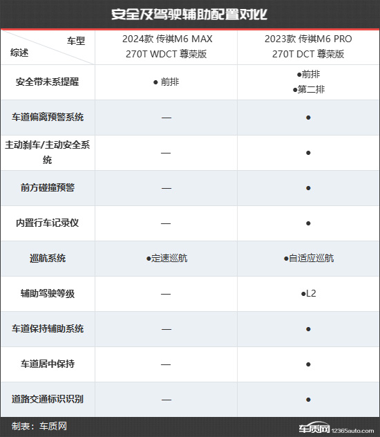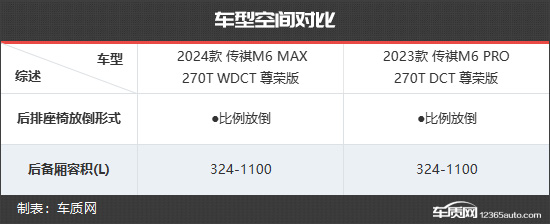 2024款传祺M6 MAX共推出1款车型,售价为14.58万元。与老款车型相比,车型数量由5款精简成了1款。为了方便查看,本文选择了售价14.98万元的2023款传祺M6 PRO 270T DCT尊荣版与售价14.58万元的2024款传祺M6 MAX 270T WDCT 尊荣版车型进行对比。