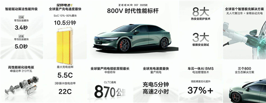 动力电池部分,2025款极氪007提供75kWh金砖电池和100kWh麒麟电池,在全栈800V高压系统的加持下,最长续航里程为688km和870km,而后者充电15分钟续航增加610km。此外,极氪007全系支持V2V对外直流供电,最大输出功率60kW。
